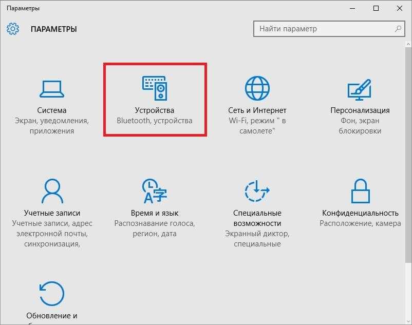 В открывшемся окне «Параметры» выберите категорию Устройства.