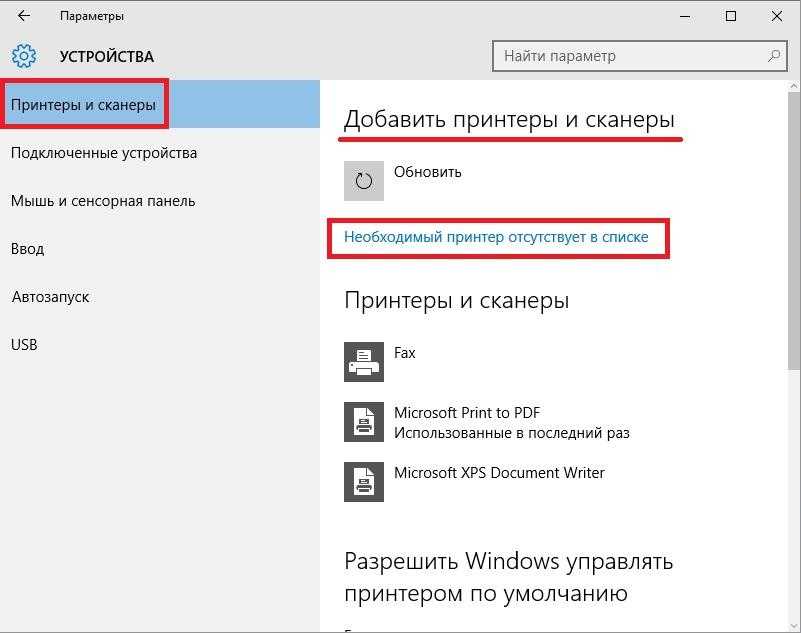 Если нужный принтер не отображается, нажмите на ссылку Необходимый принтер отсутствует в списке