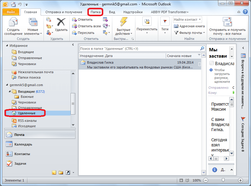 Закрываем редактор реестра, и открываем Microsoft Outlook. Если программа была открыта, то перезагружаем её. Переходим в папку, из которой произошло жесткое удаление письма, а затем перемещаемся в раздел меню «Папка».