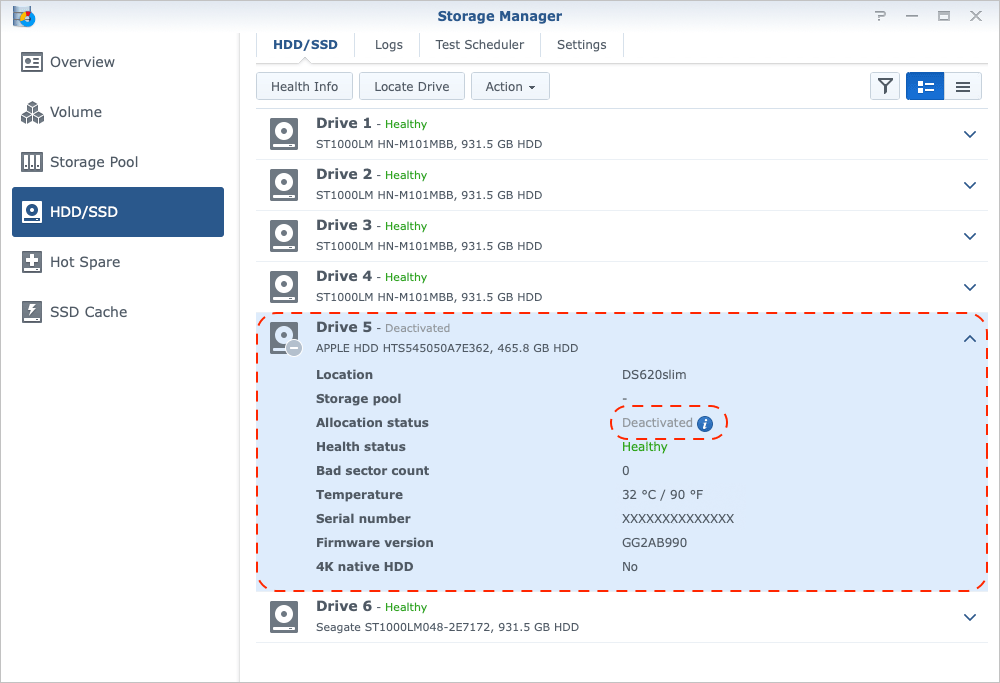 Back on the HDD/SDD page you should see that the Allocation status of Drive 5 says Deactivated.