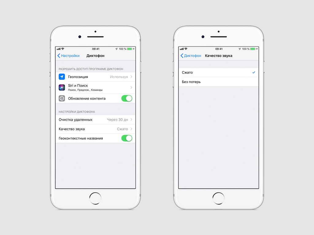 Одна из наиболее важных вкладок в настройках диктофона — «Качество звука», содержащая две позиции «Сжато» и «Без потерь». Записанная голосовая информация в сжатом виде будет иметь меньший вес, а значит, не займет много места в памяти телефона. При выборе второго варианта качество звука будет значительно лучше, но и весить такой файл, соответственно, будет гораздо больше. Этот режим полезен больше для профессионалов или в том случае, если запись ведется в сложных условиях (посторонние шумы, плохой звук). Для бытового использования режима «Сжато» вполне достаточно.