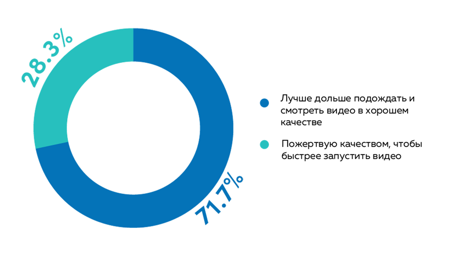 В целом, проведенные опросы среди потребителей показали, что более 2/3 зрителей предпочли бы дольше ждать запуска видео, чтобы получить контент лучшего качества, и только одна треть респондентов ответили, что предпочли бы получить свой контент быстро, даже если это означает более низкое качество картинки.