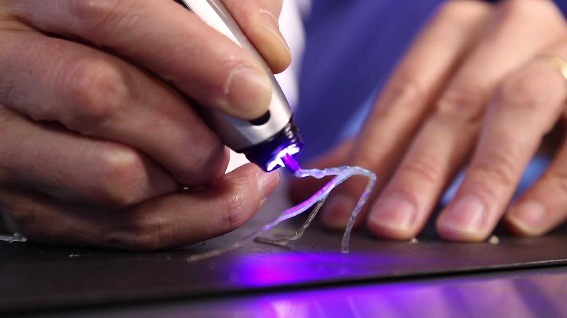 - Выдавливание фотополимера с включенными ультрафиолетовыми диодами — полимер выдавливается из ручки, подсвечивается ультрафиолетом и застывает;