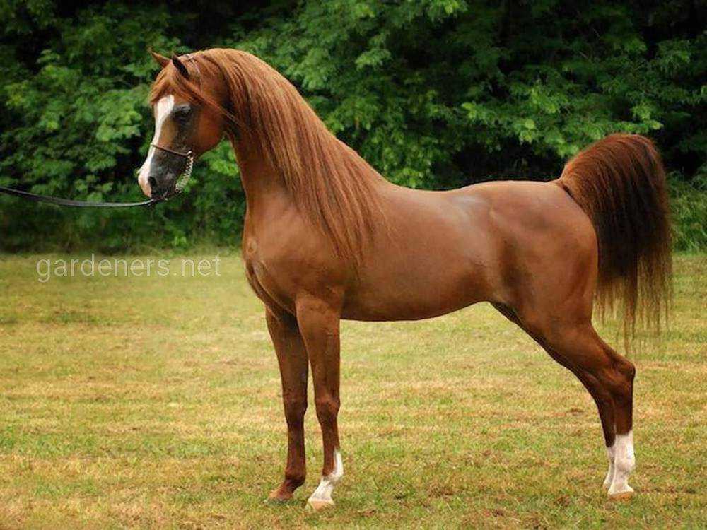 Арабские скакуны как будто сошли с иллюстраций к восточным сказкам. Эти необычайно красивые животные были выведены еще в IV–VII веках на Аравийском полуострове. Их не отличает высокий рост – у жеребцов он, в среднем, составляет всего около 153,4 см. Но длинная шея и ее красивый изгиб придают особую грациозность арабскому скакуну. Наиболее часто встречающиеся масти – серая, гнедая и рыжая. Интересная отличительная особенность этих лошадей – хвост (его еще иногда называют «петушиным), который они высоко поднимают при передвижении аллюром. Арабские скакуны являются долгожителями. Некоторые особи способны достигнуть возраста в 30 лет.