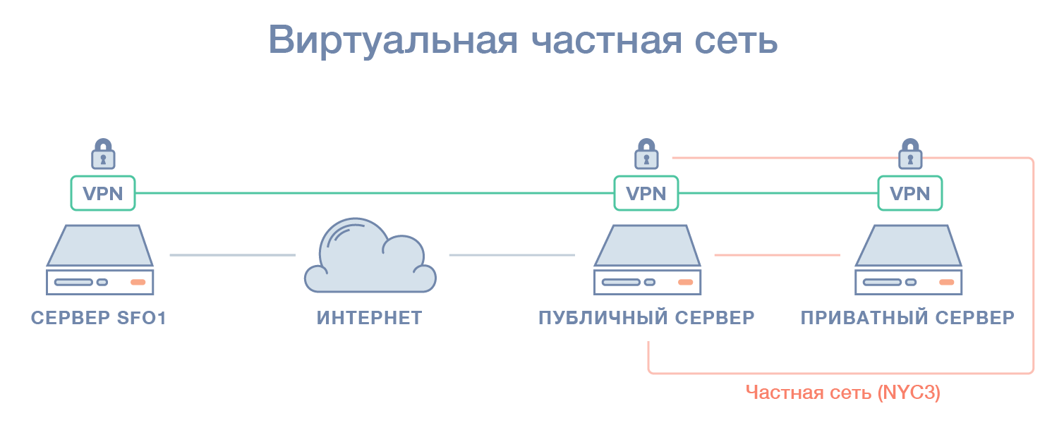 VPN, или виртуальная частная сеть, представляет собой способ создания безопасного соединения между удалёнными компьютерами, при этом компьютеры видят друг друга так, как если бы они находились в одной локальной частной сети. Это позволяет конфигурировать сервера, как если бы они находились в частной сети, организуя при этом их взаимодействие посредством защищённого соединения.