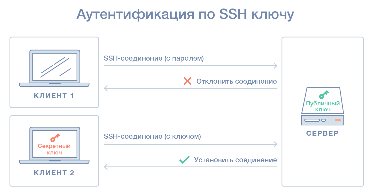 Для настройки аутентификации по SSH ключу вам необходимо поместить публичный ключ пользователя в специальную директорию сервера. Когда пользователь будет заходить на сервер, сервер будет запрашивать подтверждение того, что у клиента есть парный секретный ключ. SSH-клиент будет предоставлять секретный ключ серверу особым образом, однозначно подтверждающим владение секретным ключом. После этого сервер будет позволять пользователю осуществлять соединение без пароля. Для того, чтобы узнать больше о работе SSH ключей, рекомендуем обратиться к этой нашей статье.