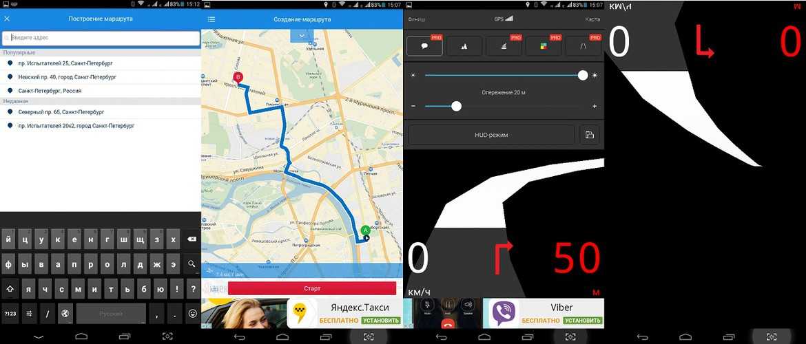 Очень быстро позиционируется, быстрее даже чем Яндекс.Навигатор. Но при вводе адреса названия улиц не подсказываются, «лишние» буквы не затемняются. Появляются имена из «контактов» или точки POI. При попытке использовать голосовой поиск приложение вылетает с ошибкой. Шрифты в адресной строке тонкие, но достаточно крупные и читабельные. На экран выводится карта, она доступна и в режиме HUD.