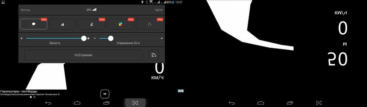 Самая близкая имитация настоящих проекторов на стекло. В режиме навигации HUD на экран выводится изображение изгиба дороги, стрелкой указывается направление и расстояние до поворота, рядом отображаются данные скорости. Здесь можно настроить яркость экрана и опережение картинки (по умолчанию 20 м). Настройки цвета и подсказки — только в платной версии.