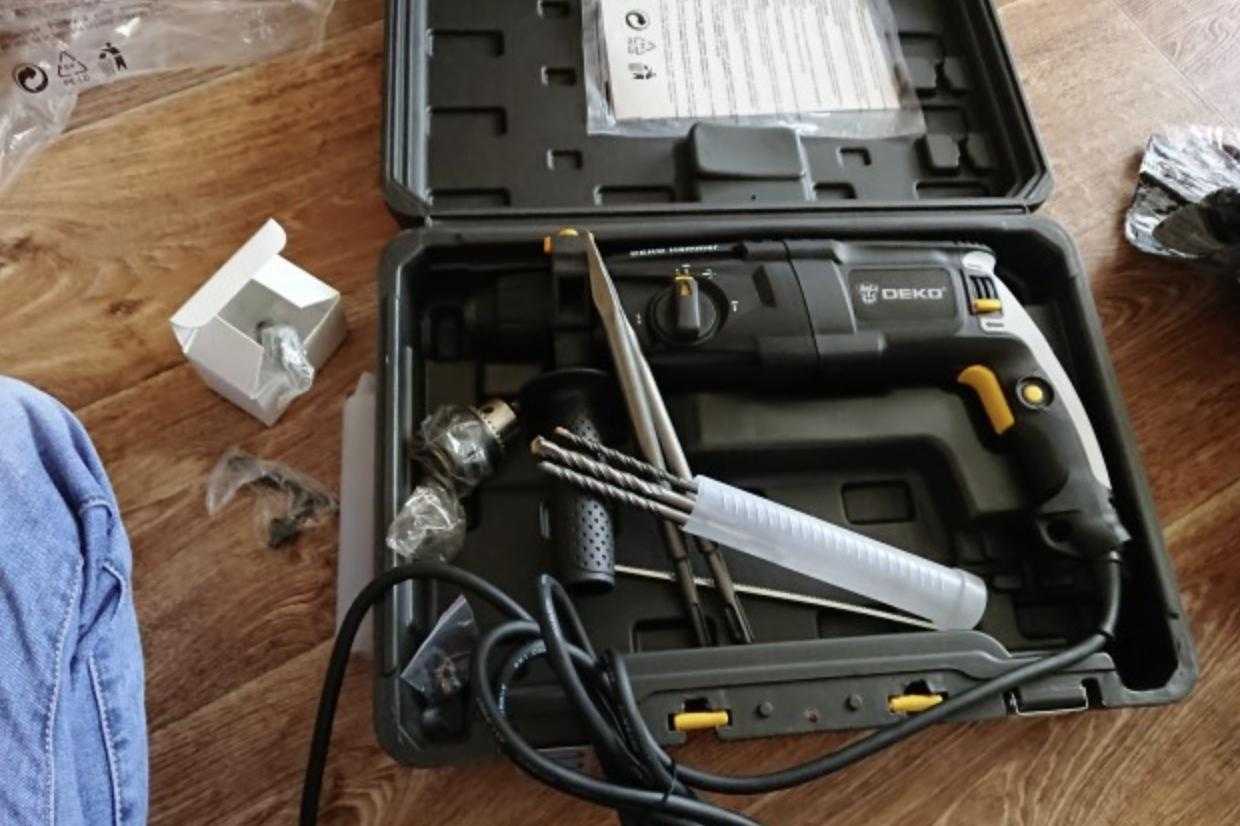 С помощью перфоратора вы сможете производить сверление и прочие буровые работы. Инструмент от Deko имеет богатую комплектацию, поэтому рекомендую его к использованию. Обладает 3-мя режимами, а скорость вращения можно регулировать сбоку посредством вертикального ползунка. Заявленная мощность инструмента составляет 900 Вт.