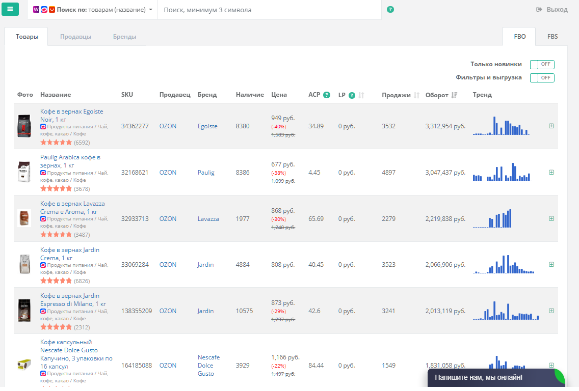 Здесь больше всего денег и сильнее всего конкуренция. Но если вы производитель или дистрибьютор качественного продукта в офлайн, советуем присмотреться к поставкам на маркетплейс. По обороту лидирует кофе в зернах — (3 млн рублей в месяц у топового продавца), а по продажам — капсульный и молотый.