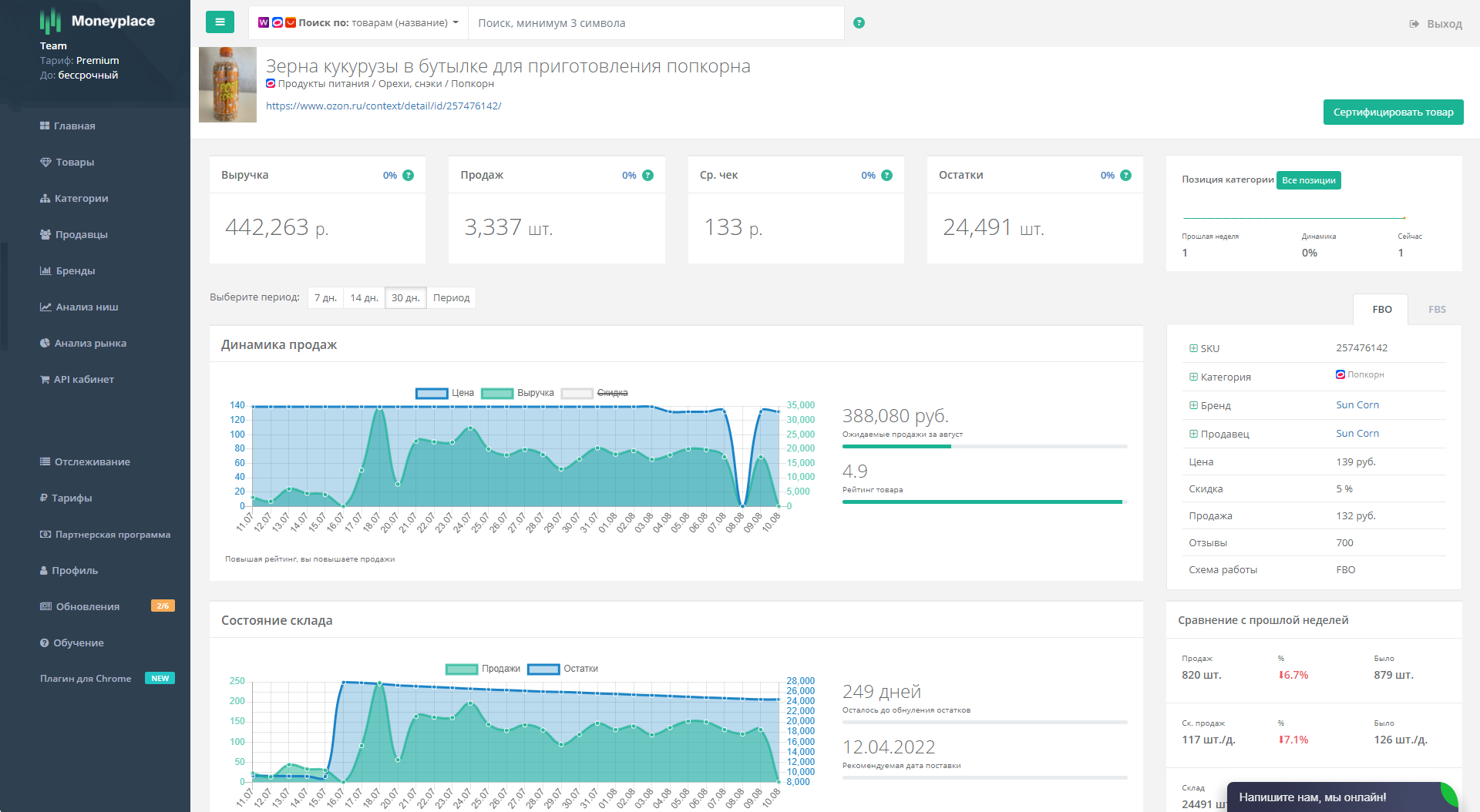 Зерна кукурузы для приготовления попкорна — цена товара 133 рубля, выручка 442 тысячи рублей;