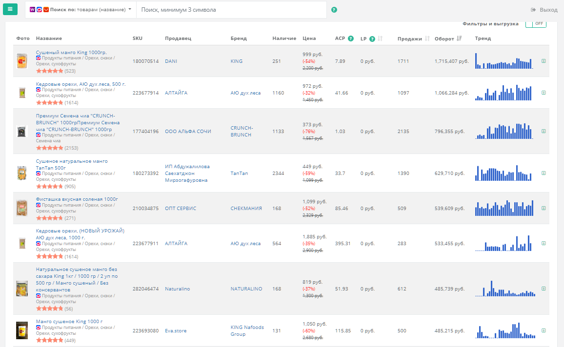 По аналитике Moneyplace в следующей по популярности категории в топе сушеный манго — 1,7 млн.руб. в месяц у лидера категории, и семена чиа — 800 тысяч рублей. Также популярны кедровые орехи — выручка 533 тысячи рублей. Смесь семян для салатов продается у одного из селлеров на 300 т.р. в месяц.