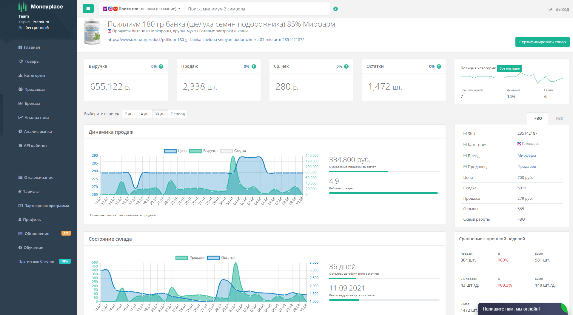 Шелуха семян подорожника — средний чек 280 рублей, выручка 335 тысяч рублей в месяц.