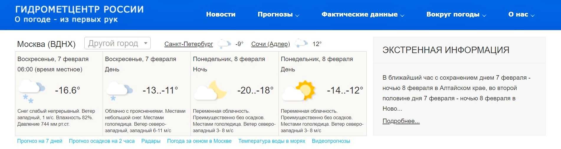 Свой ресурс в Интернете имеет и российский Гидрометцентр. Свою работу он начал в1930 году, и с тех пор публикует актуальную информацию о погоде в 5000 российских городов, а также в различных европейских регионах. Кроме того, здесь имеется климатическая статистика, архив всех, ранее публикуемых прогнозов, погодные новости.