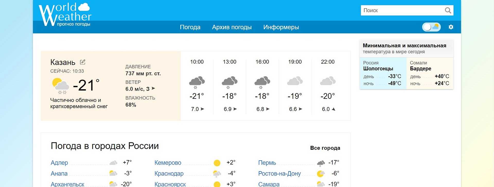 Этот российский ресурс является лидером по посещаемости среди отечественных пользователей. Он весьма точен в прогнозах, комфортен в навигации и лаконичен. Простое исполнение, ненагруженность лишними элементами, развернутые сведения – вот причины, по которым портал считается одним из лучших среди российских служб метеорологии.