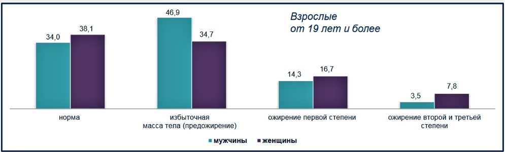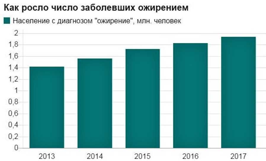 За последнее время число не просто тучных граждан, а именно лиц, страдающих клиническим ожирением, перевалило через отметку в 2 000 000 человек, что составляет более 1,3% всего населения России. При этом избыточную массу тела, по данным главы Росстата Александра Суринова, имеют около 40% трудоспособного населения (т.е. лиц в возрасте от 19 до 60 лет). Динамика в нашей стране такова, что наибольший темп роста массы тела наблюдается у молодых людей: с 2011 по 2018 г. доля ожиревших граждан в возрасте от 16 до 24 лет возросла втрое и составила 6%. Именно такие цифры получены по результатам социологических опросов 4000 человек, проведенных «Левада-центром» по заказу НИУ ВШЭ.