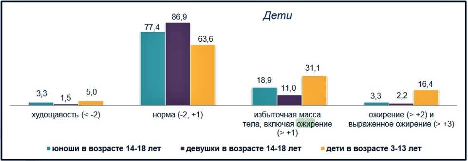 А сколько толстых людей в России? На этот вопрос лучше всего ответили эксперты из Высшей школы экономики, которые на основании опросов граждан пришли к выводу, что у 50% россиян есть избыточный вес. Росстат вообще бьет тревогу: за последние 15 лет число подростков с ожирением выросло в 2 раза. 36% девочек и около 26% мальчиков каждый день употребляют сладости, а овощи входят в рацион только 35% российских детей. Исходя из данных статистики, дети употребляют одинаковое количество сладостей и полезной пищи: данное соотношение не позволяет отнести их рацион к разряду «здорового питания».